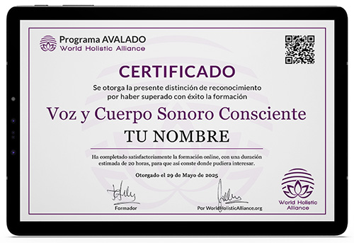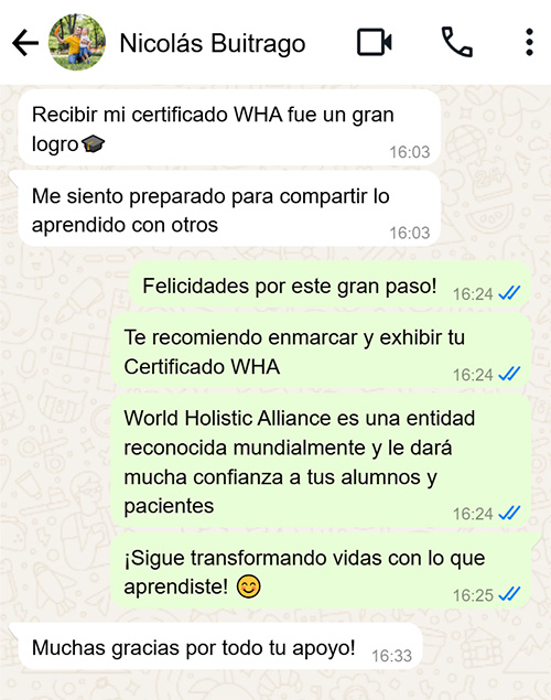 Una vez que concluyas la formación, podrás descargar tu certificado personalizado con tu nombre, avalado por WHA - WORLDHOLISTICALLIANCE.ORG, sin ningún costo extra. Ingresarás en el listado oficial online de alumnos certificados WHA.