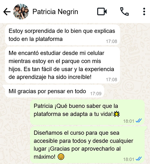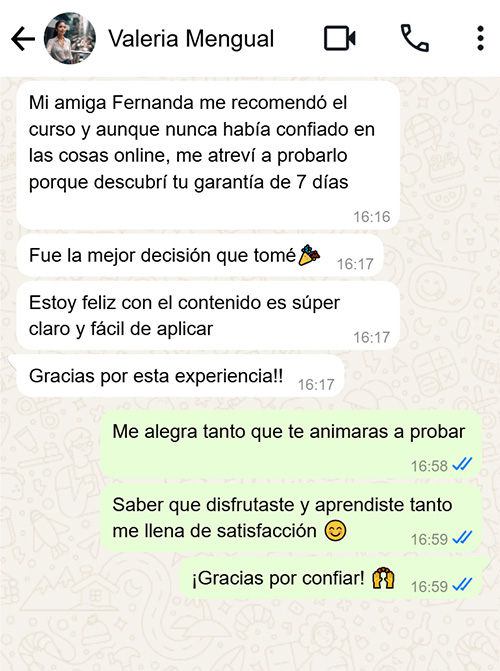 Apenas realices el pago recibirás por correo el acceso y podrás comenzar de inmediato con el curso. Ya tienes todo el contenido grabado, para que puedas verlo a tu ritmo, sin presiones. Podrás hacerme todas las consultas que desees.