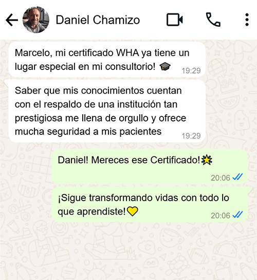 Una vez que concluyas la formación, podrás descargar tu certificado personalizado con tu nombre, avalado por WHA - WORLDHOLISTICALLIANCE.ORG, sin ningún costo extra. Ingresarás en el listado oficial online de alumnos certificados WHA.